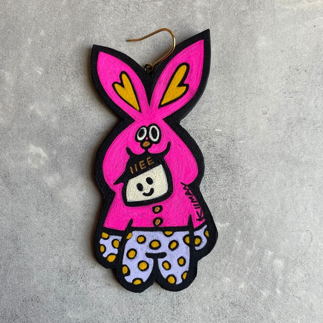 【ウサギのパジャマーボ】25022402 ※金具選択可能 ・ピアス ・イヤリング ・キーホルダー(ピンク or ブラック) ・ブローチ(上のマルカンは残ります) ・ネックレス紐(60cm うち55cmに調整可能) からお選び頂き、 購入時の備考欄に記載ください。 ※インスタのDMかMAILでもご連絡可能です。 ウサギパジャマを着た冬仕様の ニボくんです☆ IIEE project KIIMAN × NEEVO 〜KIIMANがニボクンを描いてみました〜シリーズ 会社員NEEVOが産み出した生命体“ニボくん” ニボくんへの“好き”が生じて二次創作した ニボくんシリーズです。 お好みのニボくんを選んでください✴︎ NEEVO ・2006年ノイズユニット“divideperzero“始動。 ・2018年ライヴペインティングユニット”ODANEEV“始動。 ・2021年KIIMANの『II』とNEEVOの『EE』がくっついた、ユニット【IIEE】を結成。双方の共通言語=「イイそれ!」から産まれたアートワークを展開&進行中。 ・イベントのオーガナイズ、カレー出店、お店のヘルプなど幅広く活動。自身のマスコット「ニボくん」はコアなファンから着実に愛されつつある。 ///////////////////// ▶︎▶︎▶︎▶︎▶︎▶︎▶︎▶︎▶︎▶︎▶︎▶︎▶︎▶︎▶︎ 素材 : ヌバック/牛革 塗料 : 油彩絵具/フィキサチーフ/タブロー 金具 : ステンレス モチーフ全体サイズ :70mm×35mm